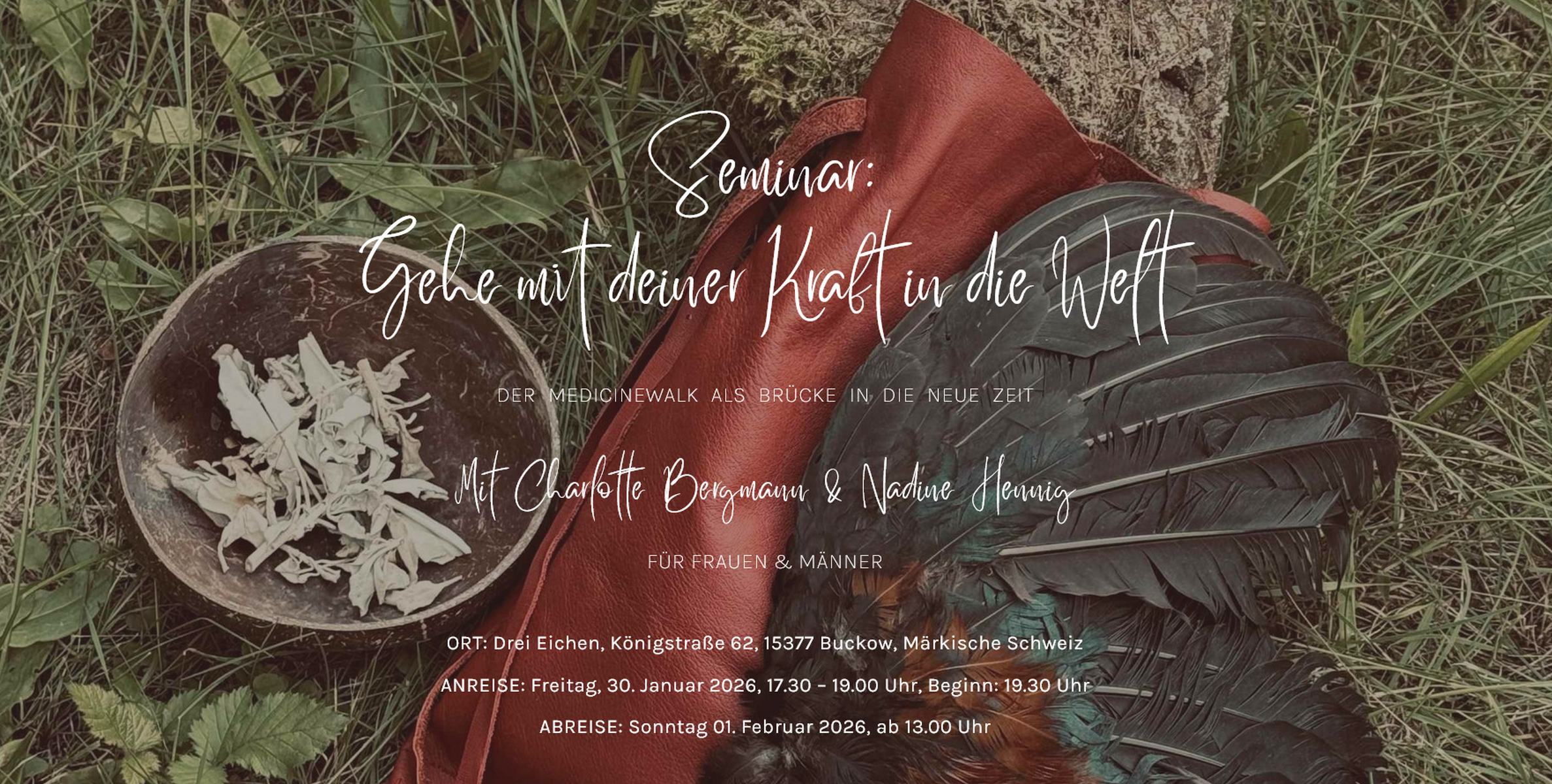 Während des Seminars bist Du eine Weile draußen unterwegs, in der Begegnung und im Zwiegespräch mit Mutter Erde. Charlotte Bergmann und Nadine Hennig hüten solange die Schwelle, über die Du hinaus gegangen bist, heißen dich willkommen zurück und begleiten dich während des Seminares mithilfe des Medizinrades, den Spiegel der Natur zu lesen und die Erfahrungen draußen in dein Inneres, dein Alltagsleben zu integrieren.
